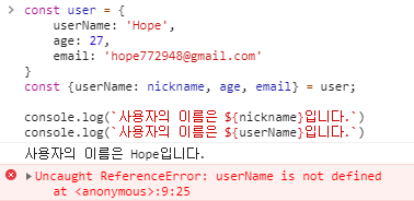 const {userName: nickname, age, email} = user;