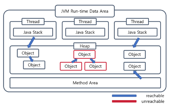 이 중 힙 내의 다른 객체에 의한 참조를 제외한 나머지 3개에서 참조될 경우 reachable로 판단되며, reachable한 객체가 참조되고 있는 객체 또한 reachable이 된다.