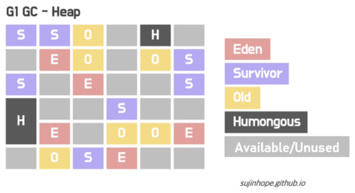 G1 GC에서는 Eden, Survivor, Old, Humongous, Available/Unused라는 다섯가지 Region을 사용한다. Humongous 영역은 REgion크기의 50%를 초과하는 객체를 저장하기 위한 공간이며 Available/Unused는 사용되지 않고 비어있는 Region이다.