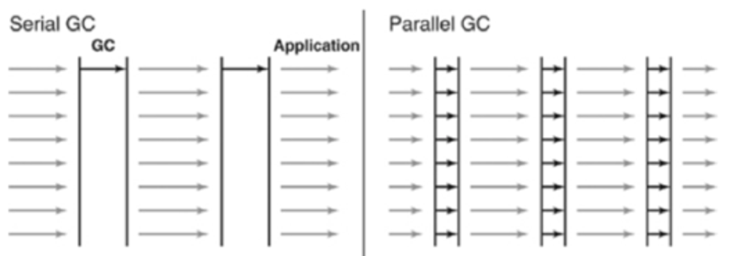 Parallel GC는 Throughput GC라고도 부르며 Serial GC와 기본적인 알고리즘은 같지만 Serial GC는 쓰레드가 하나인 반면 Parallel GC는 쓰레드가 여러 개이므로 Serial GC보다 빠른 성능을 보장한다. 메모리가 충분하고 코어의 수가 많을 때 유리하다.