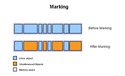 객체가 처음 생성되면 객체의 mark bit를 0으로 세팅하고 Mark 단계에서 모든 reachable 객체에 bit를 1(true)로 마킹한다. 마킹 작업은 단순 그래프 탐색을 요구하기 때문에 깊이우선 탐색을 이용한다.