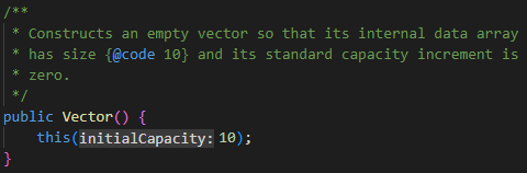 자바에서 설정된 기본 세팅으로 벡터가 생성된다. initialCapacity는 10으로 설정되고, capacityIncrement는 0으로 설정된다.