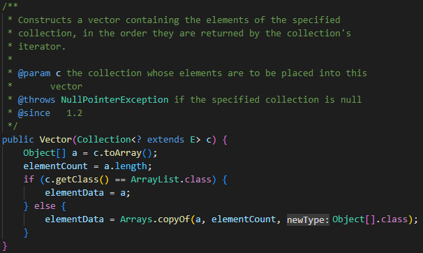 실제로 내부구현은 아래와 같이 되어있으며 Arrays.copyOf 메서드를 이용하여 입력받은 collection 파라미터를 복사한다. collection이 null일 경우 NullPointerException이 발생한다.