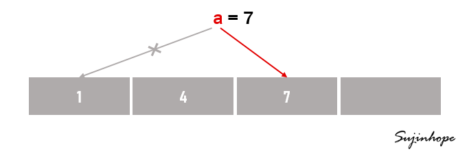 a = 7 // 새로운 메모리 할당, a가 새로운 메모리를 가리킴