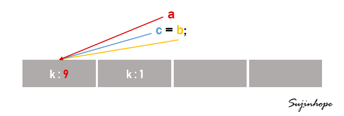 console.log(a, b, c, a === c) // {k: 9} {k: 9} {k: 9} true