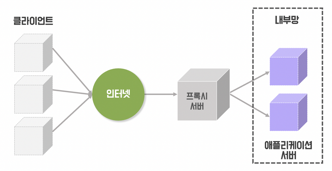 이 경우, 클라이언트는 애플리케이션 서버를 직접 호출하는 것이 아니라 프록시 서버를 통해 호출하기 때문에 리버스 프록시는 애플리케이션 서버를 감추는 역할을 하게 된다.