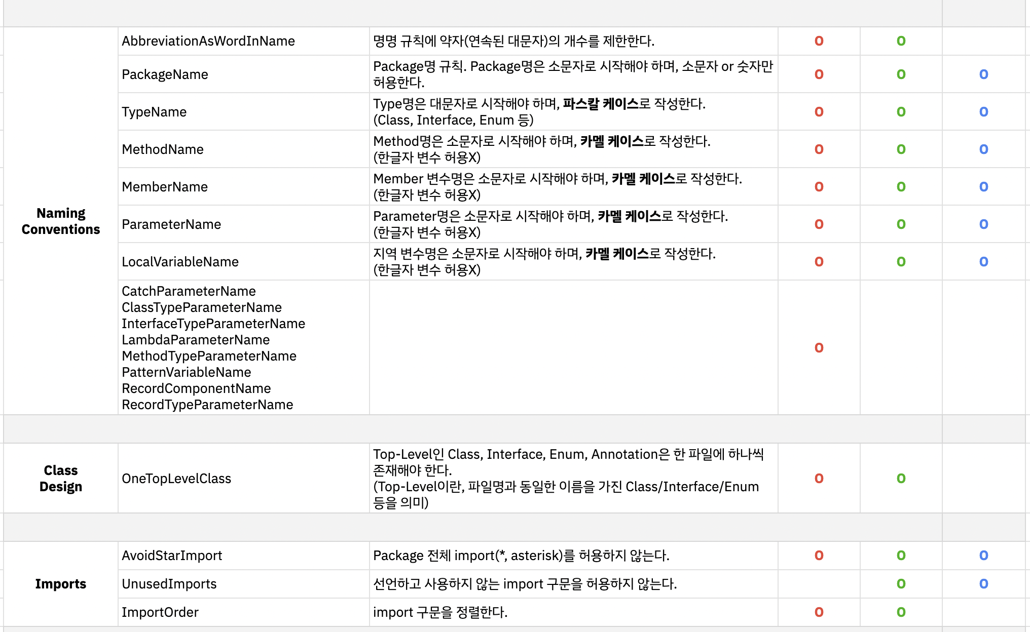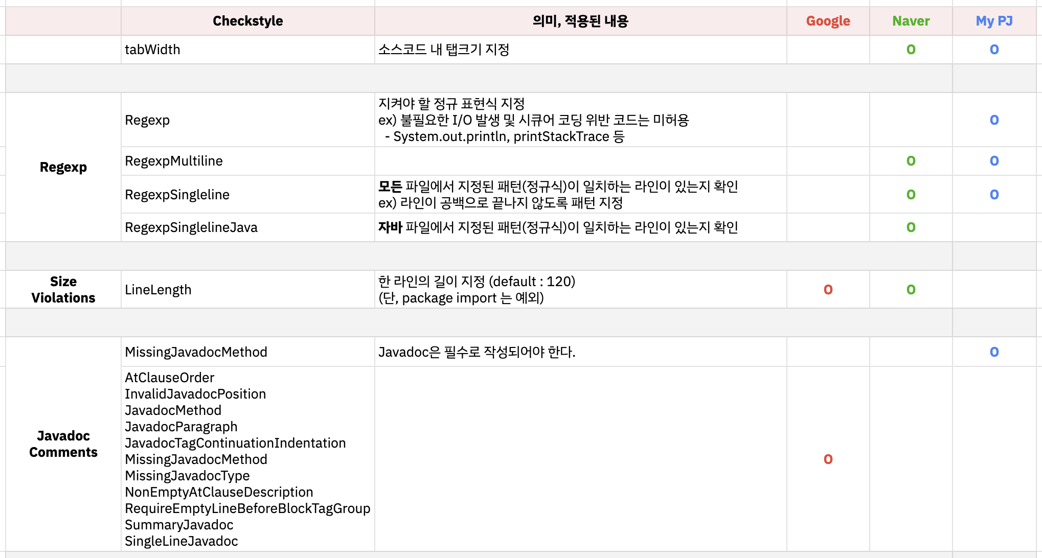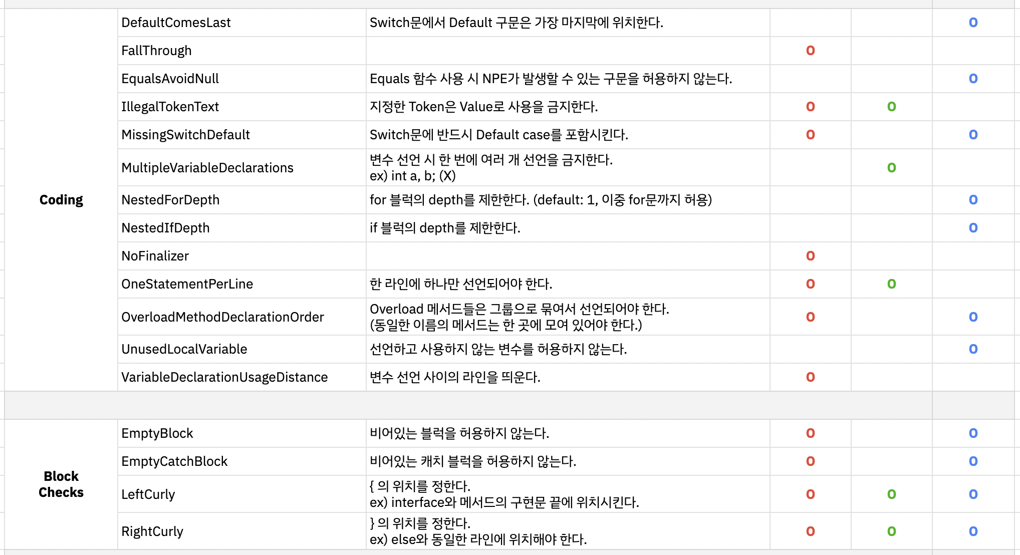 Checkstyle 적용 내용은 나오지만 막상 그게 무슨 정책인지 어렵고 Google과 Naver가 각각 어떤 정책들을 선택해서 적용하고 있는지 한 눈에 파악하기 어려워서 직접 정리해보았다!!