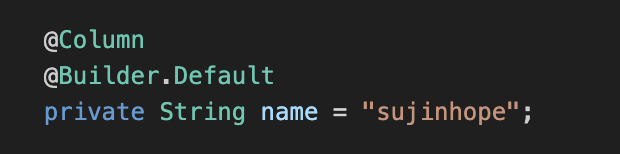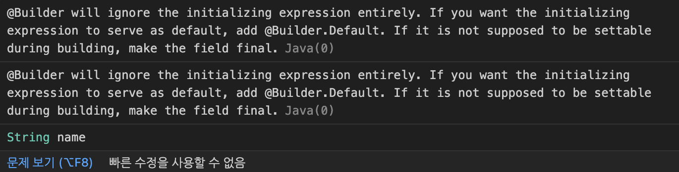 @Builder는 초기화 표현을 완전히 무시한다. 초기화 표현식으로 default를 설정하길 원한다면 @Builder.Default 를 추가하라는 것이다. 혹은 만약 해당 값을 중간에 setting 하지 않을 것이라면, final 필드로 선언하여 사용하면 된다.