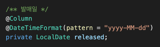 DateTimeFormat 어노테이션을 달아주고 pattern에 내가 원하는 데이터 포맷을 입력하면 된다.
