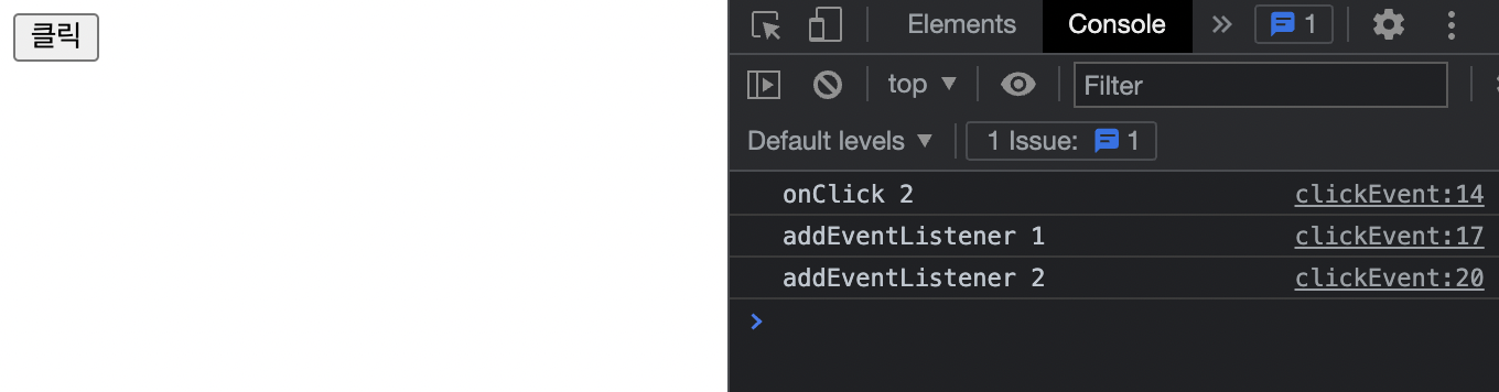 클릭버튼을 이용하여 간단하게 예제를 만들어보았다. 버튼을 클릭했을 때의 이벤트 리스너를 onclick으로 두 번, addEventListener로 두 번 동작하게 하고 버튼을 클릭해보았다.