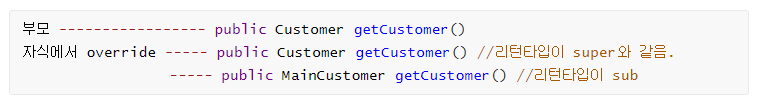 - access modifier(접근 제한자)는 부모와 같거나 보다 넓은 범위로 정의.