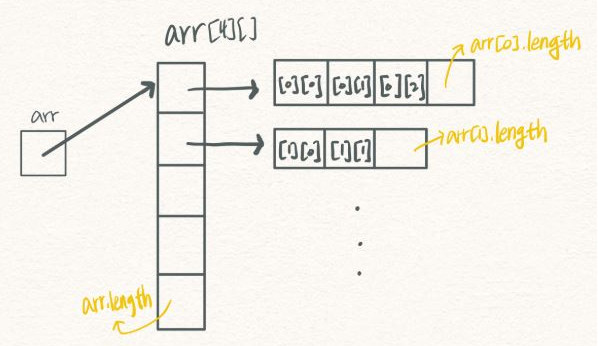 - 자바에서는 다차원 배열이 참조 형식으로 되어 때문에 열의 크기가 고정되지 않아도 된다.(즉, 행의크기만 선언해도 됨)