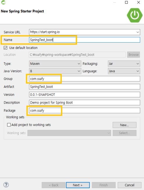 Spring Boot 프로젝트 생성 시 맨 아래 노란색 박스에 있는 Package명과 현재 내가 생성한 Package명이 동일한지 확인한다.